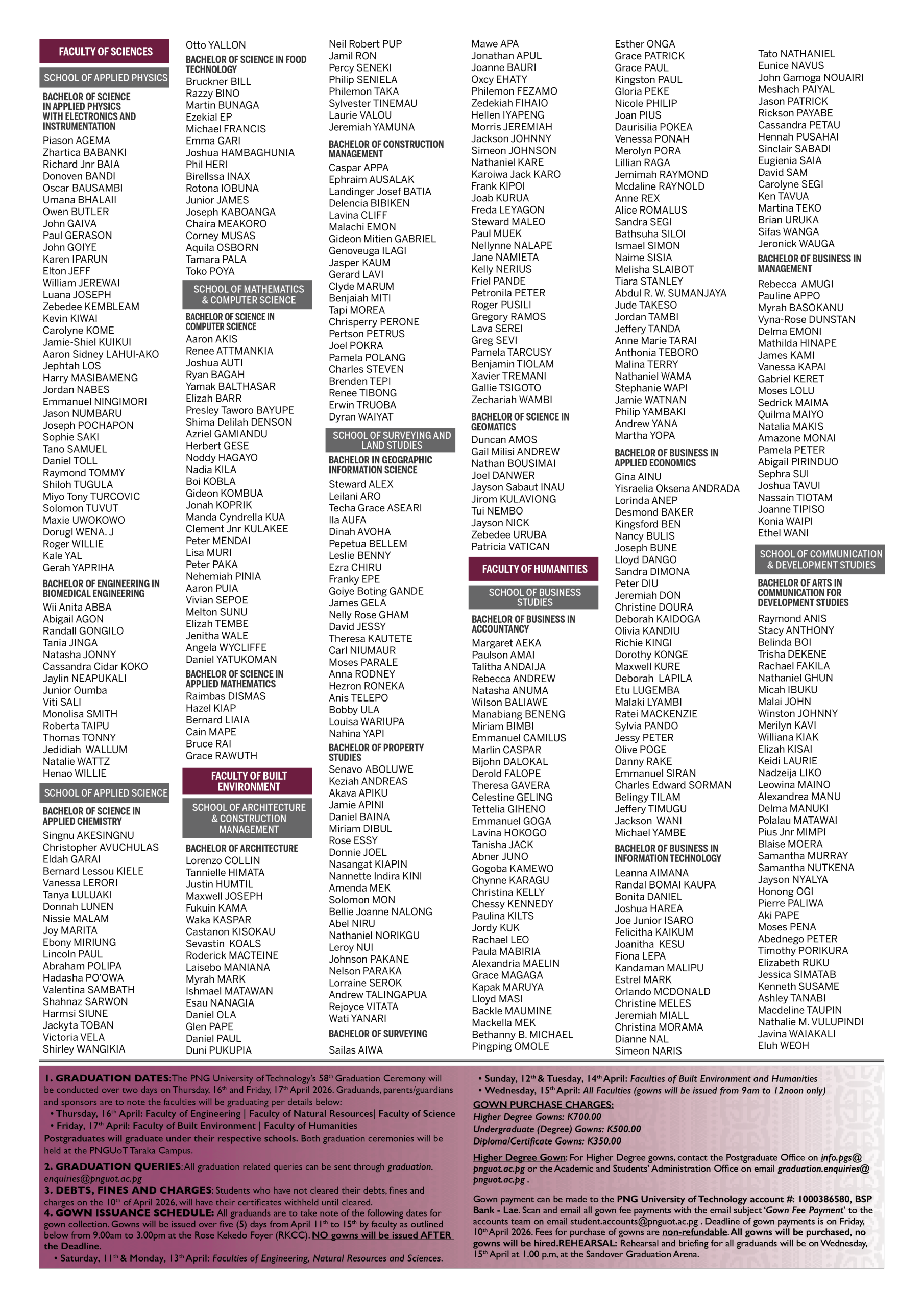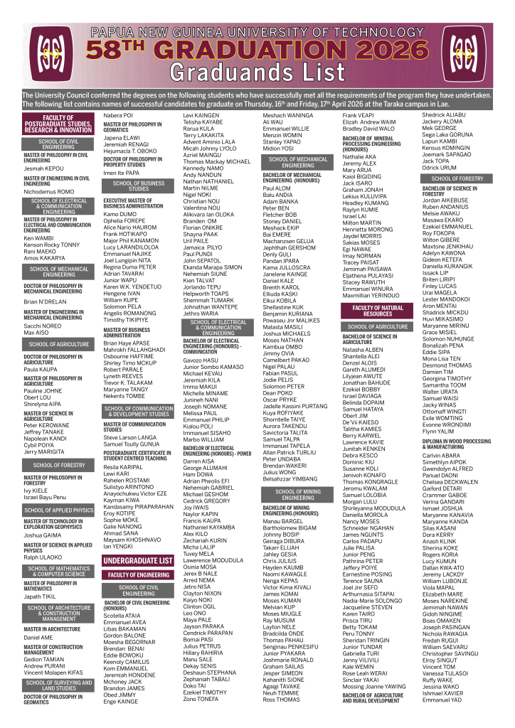 1. GRADUATION DATES: The PNG University of Technology’s 58th Graduation Ceremony will be conducted over two days on Thursday, 16th and Friday, 17th April 2026. Graduands, parents/guardians and sponsors are to note the faculties will be graduating per details below: