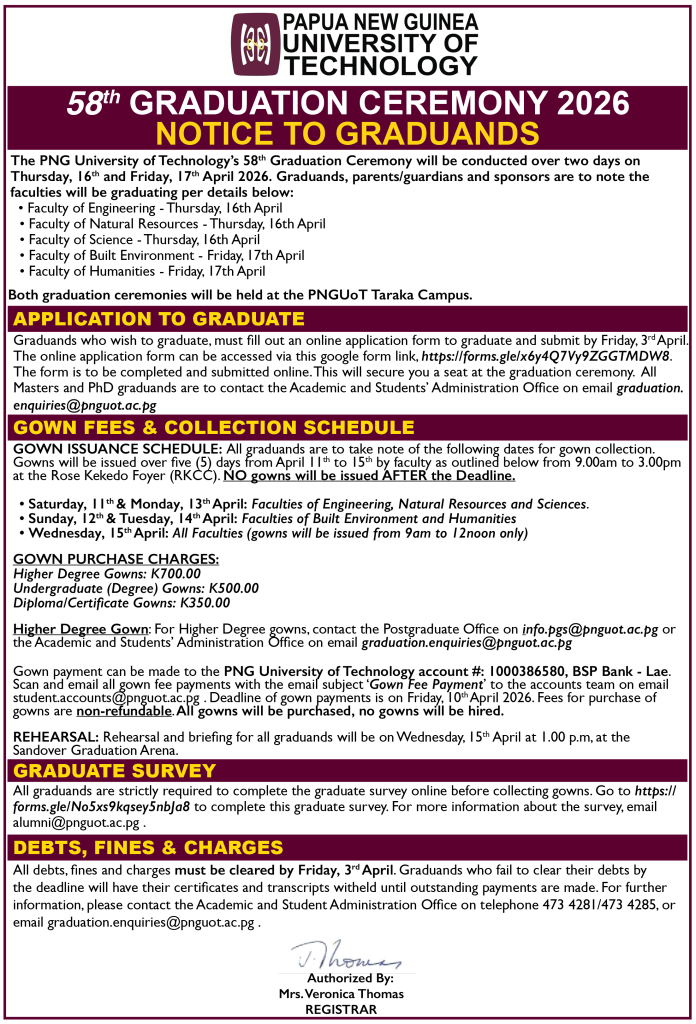 We are pleased to share the notice below, which contains information about PNGUoT’s 58th Graduation Ceremony, to be held over two days on Thursday, 16th and Friday, 17th April 2026, at the university’s Taraka Campus in Lae, Morobe Province.